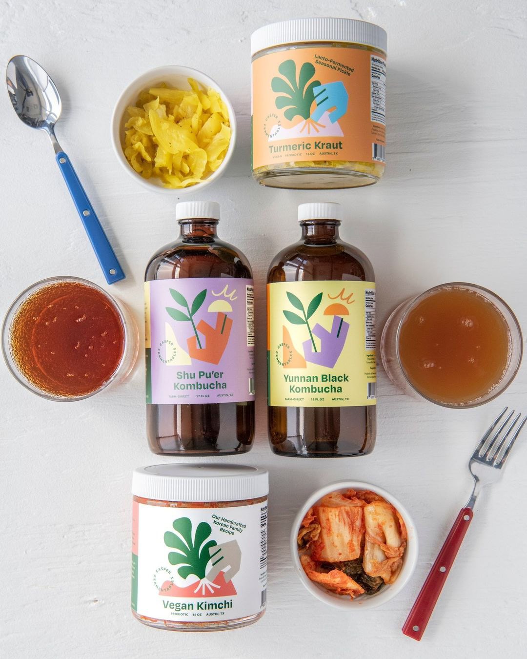 I worked with Ben and Sarah of Casper Fermentables on new packaging and a rebrand. They semi-recently expanded from a pop-up to a storefront in Austin. Check out their kimchi, kombucha, and sourdough goods in the southish area! Store designed by OPA Design Studio Mural painted by Sophie Turok Most photos by Austinites