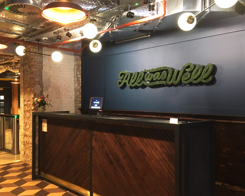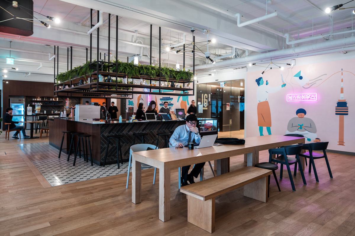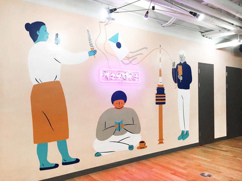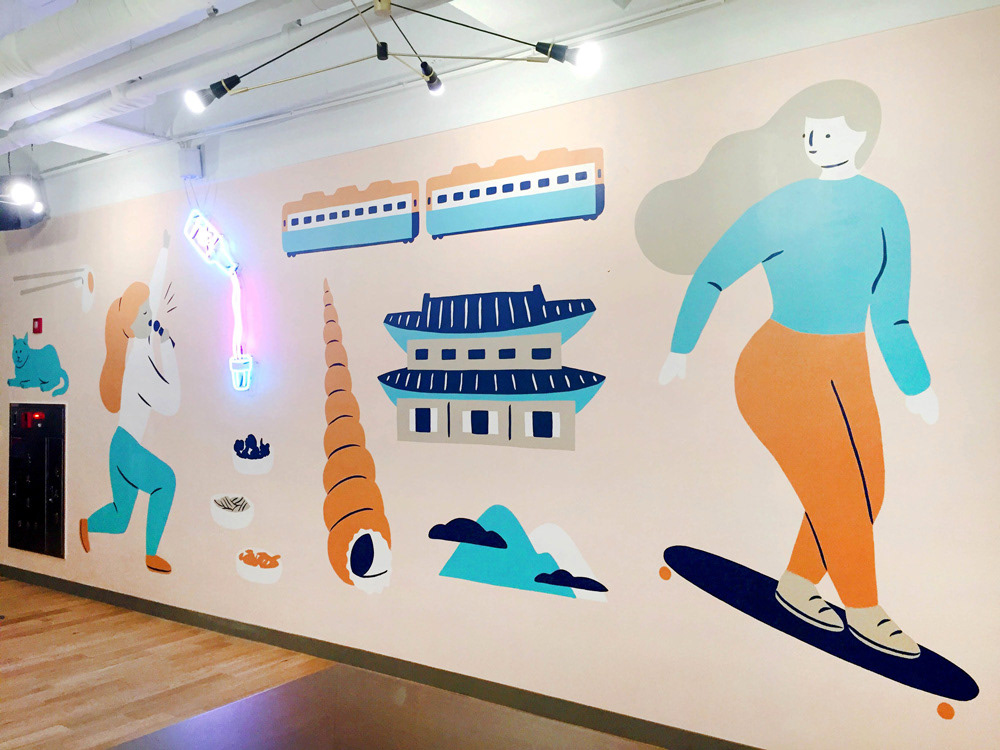 Various installation projects involving design, illustration, and lettering for WeWork Mural Design and Illustration Collaborator: Jocelyn Tsaih Neon Production: Let There Be Neon Banner Production: Oxford Pennant